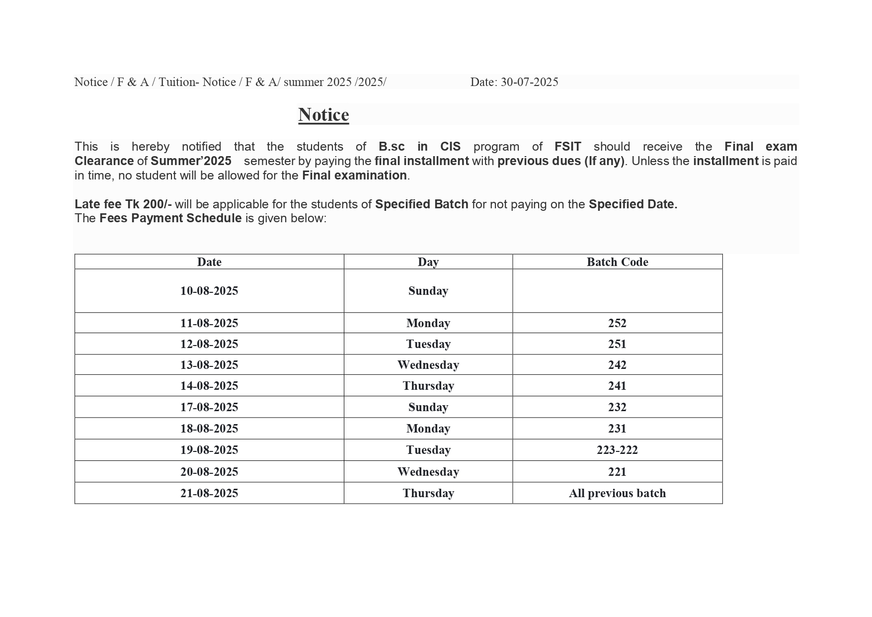 This is hereby notified that the students of B.sc in CIS program of FSIT should receive the Final exam Clearance of Summer’2025 semester by paying the final installment with previous dues (If any). Unless the installment is paid in time, no student will be allowed for the Final examination. Late fee Tk 200/- will be applicable for the students of Specified Batch for not paying on the Specified Date. The Fees Payment Schedule is given below: